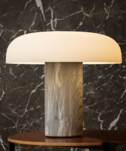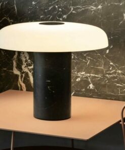 Lampada da tavolo a luce diffusa dimmerabile, con montatura in marmo, diffusore in vetro soffiato opalino acidato e bottone centrale in metallo galvanizzato. Cavo di alimentazione, dimmer e spina neri. Alimentatore su spina con plug intercambiabile.