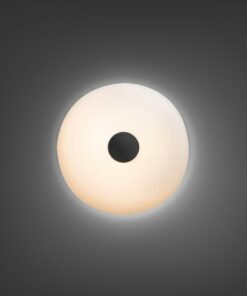 Lampada a parete o soffitto a luce diffusa dimmerabile a taglio fase, con diffusore in vetro soffiato opalino acidato e bottone centrale in metallo galvanizzato.