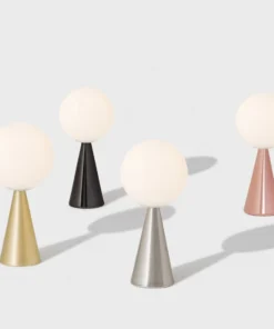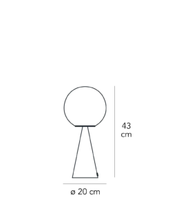 Lampada da tavolo, una sfera poggiata, in apparente impossibile equilibrio, su un cono che fa da base. Una delle tante magie compositive di Gio Ponti, progettata nel 1932. La contrapposizione di due forme geometriche elementari da origine a un oggetto originale e dalle proporzioni perfette. Una composizione semplice che si arricchisce grazie allo straordinario equilibrio delle proporzioni e all’eleganza discreta dei materiali non riflettenti. La luce è diffusa e l’emissione luminosa è valorizzata dall’essenzialità geometrica del disegno. Lampada da tavolo a luce diffusa. Montatura in metallo. Diffusore in vetro soffiato bianco satinato. Cavo di alimentazione e spina trasparenti. Spina europea due poli.