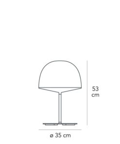 Lampada da tavolo a luce diretta non dimmerabile. Montatura in metallo verniciato, diffusore superiore in policarbonato verniciato, diffusore inferiore in policarbonato opalino. Cavo, interruttore e spina trasparenti, spina europea due poli. Fonte luminosa non inclusa.