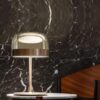 Lampada a sospensione, una reinterpretazione in chiave contemporanea delle classiche lampade con paralume in vetro. Se nelle tradizionali abat-jour il diffusore alloggia al suo interno la sorgente luminosa, in questa famiglia di lampade il diffusore è paradossalmente e suggestivamente vuoto e l’effetto luminoso è prodotto da due dischi luminosi all’interno di una fascia metallica centrale, visibile sul paralume e che richiama la linea dell’equatore. La luce prodotta dai Led, grazie a schermi interni disposti a strati, si distribuisce regolarmente sulla superficie dei dischi, irradiandoli magicamente di luce. Il disco inferiore produce un’emissione luminosa verso il basso, quello superiore illumina la calotta di vetro, per una diffusione morbida della luce. Disponibile da tavolo, da terra e da sospensione, in due misure, si declina in quattro tonalità.