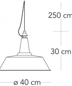 Lampada a sospensione a luce diretta dimmerabile. Diffusore e gancio in metallo verniciato, cavo di sospensione in acciaio, cavo di alimentazione trasparente, rosone in materiale termoplastico verniciato.