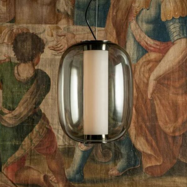 Lampada da tavolo dal design originale e prezioso, composta da un diffusore conico a strati di vetro opalino, sorretto da una base in vetro trasparente che cela la struttura in metallo, tutta a incastro. Un oggetto di natura fortemente decorativa, prodotto con tecniche produttive tradizionali come la soffiatura a bocca del vetro.