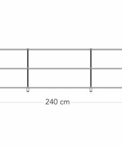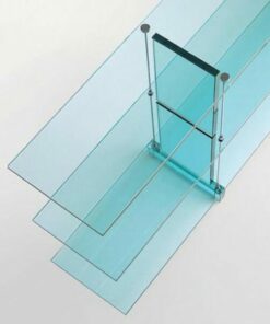Consolle aperta sui due lati, ripiani e montanti in vetro float e tiranti in metallo cromato
