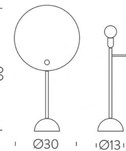 Lo schermo circolare è verniciato in bianco e nero, lo stelo e le minuterie metalliche e il supporto semisferico sono cromati. Versione da tavolo con base in marmo bianco.