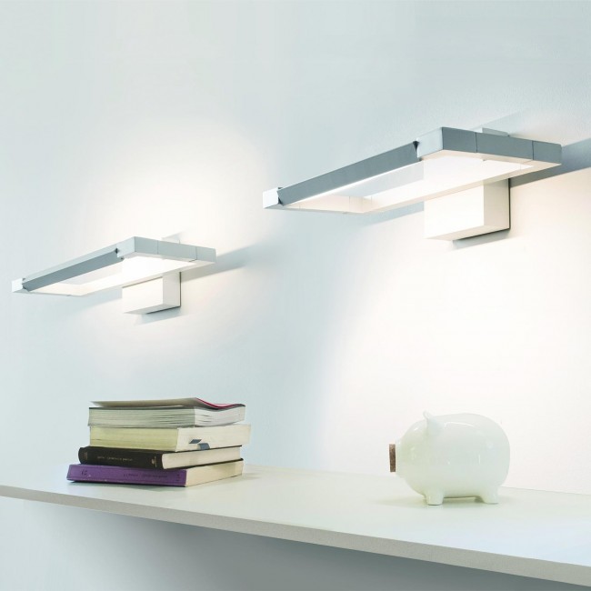Gli snodi permettono ai profili dotati delle sorgenti LED di ruotare a 360° in modo da fornire una luce diretta o indiretta, dotata di un diffusore opalino in policarbonato. Lampade disponibili verniciate bianche o nere.