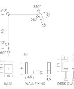 Famiglia di lampade da tavolo/terra e parete LED in estruso di alluminio verniciato nero opaco dotata di snodi per il posizionamento flessibile e dinamico della luce.