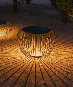 Lampada da terra o tavolo per esterni, dotata di una struttura in fili di acciaio disposti in modo circolare e luce LED