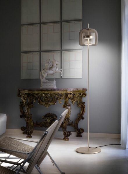 Il vetro trasparente, disponibile nei colori fumé, terra bruciata, verde antico, cristallo e ametista, con sorgente luminosa LED, finiture metalliche in oro satinato, acciaio satinato e nero opaco.