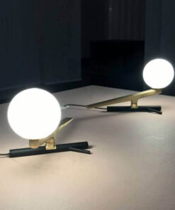 Sono iconiche rondini dal corpo in ottone spazzolato, con il capo come una sfera in vetro bianco che racchiude la luce, libere o racchiuse in gabbie di vetro.